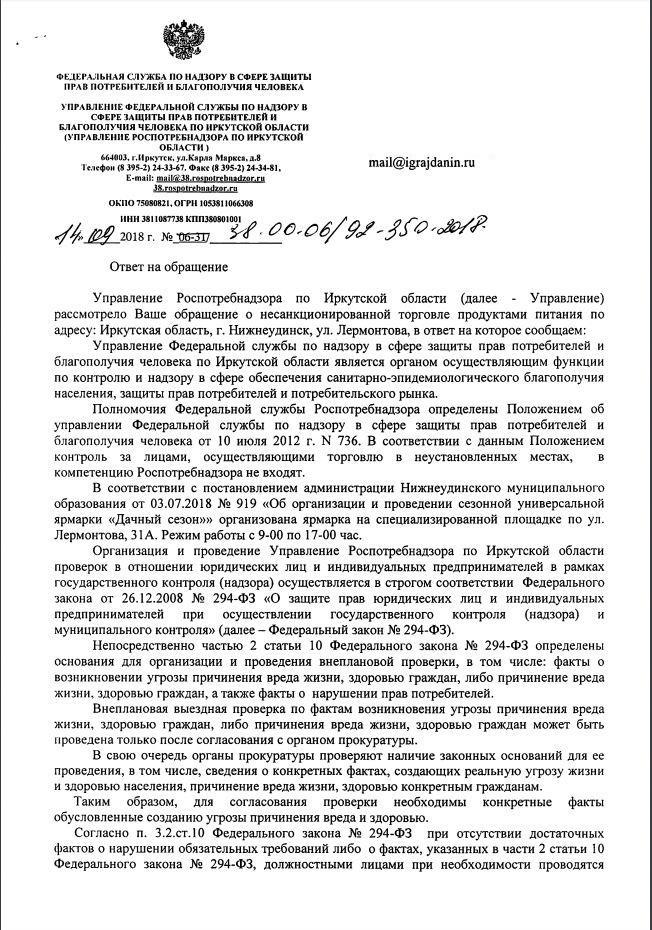 айГражданинОтправлено 14.08.2018: "Управление Роспотребнадзора по Иркутской области"