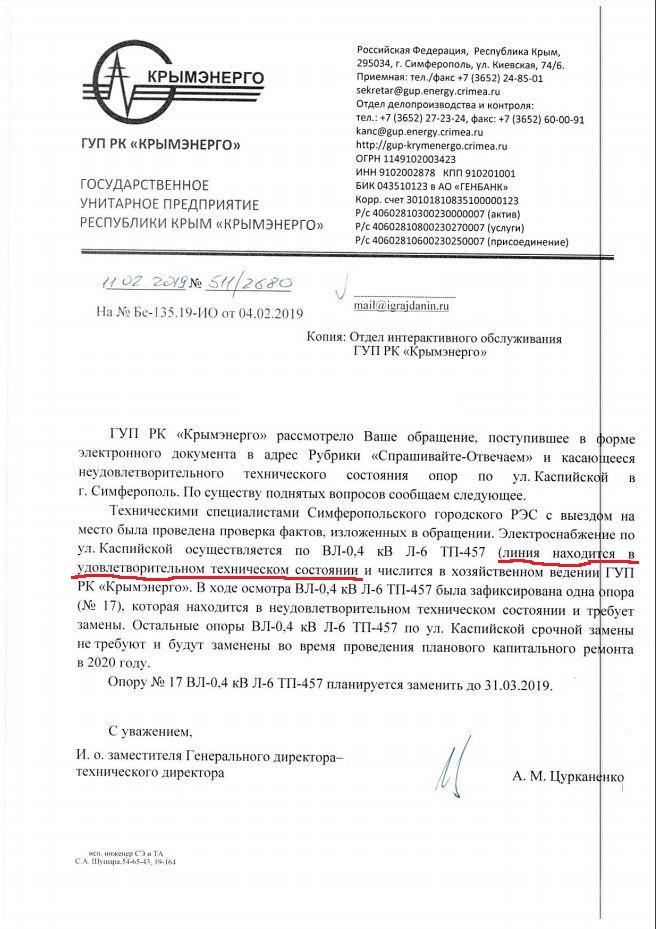 айГражданинОтправлено 01.02.2019: "Государственное унитарное предприятие Республики Крым "Крымэнерго""