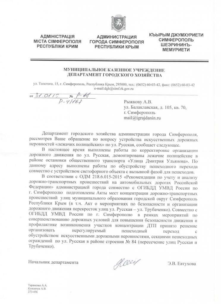 Проблема по прежнему актуальна. В ответе, предоставленном Департаментом городского хозяйства г. Симферополь, идет ссылка на Акт о мероприятиях по безопасности и организации дорожного движения перекресток улиц ул. Русская - ул. Трубаченко. Но не указан номер и дата составления данного акта, что не является обоснованным ответом.