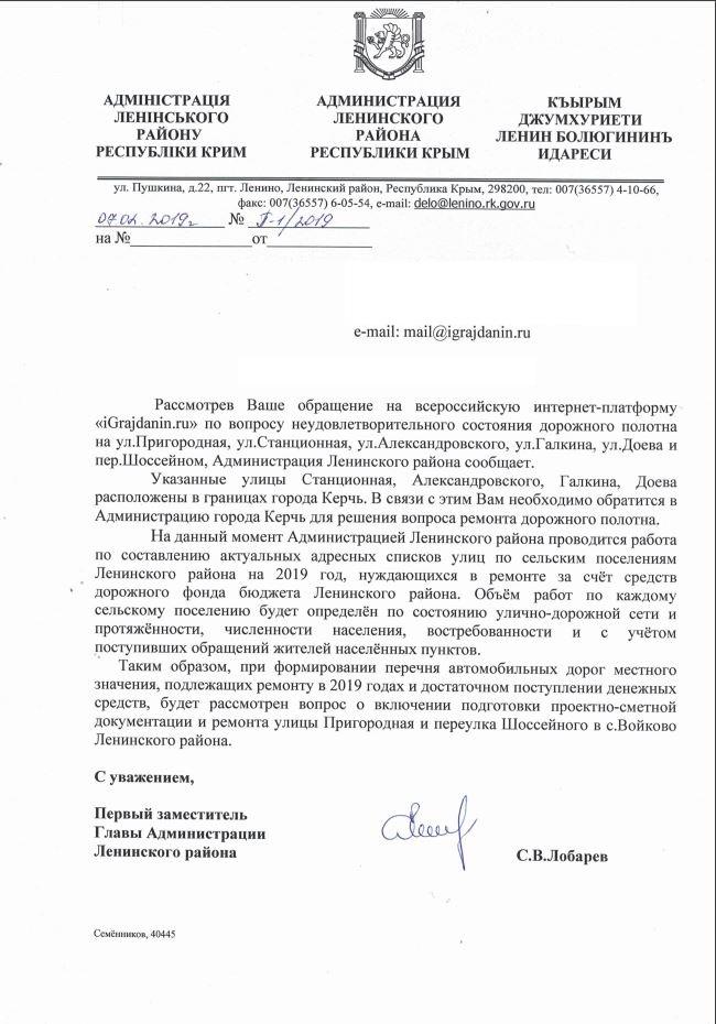 айГражданинОтправлено 09.01.2019: "Администрация Ленинского района Республики Крым"