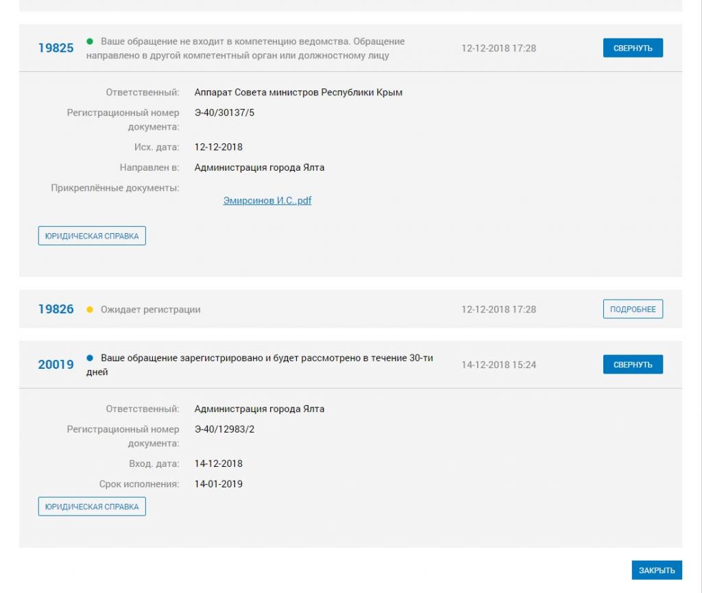 · Выполнено – Все мероприятия закончены. По мнению Пользователя, создавшего Обращение или сделавшего его Официальным, проблема решена. Либо после истечения установленного Системой срока и поступления автоматических уведомлений от Системы на электронный адрес Пользователя последний не подтвердил актуальность Обращения.