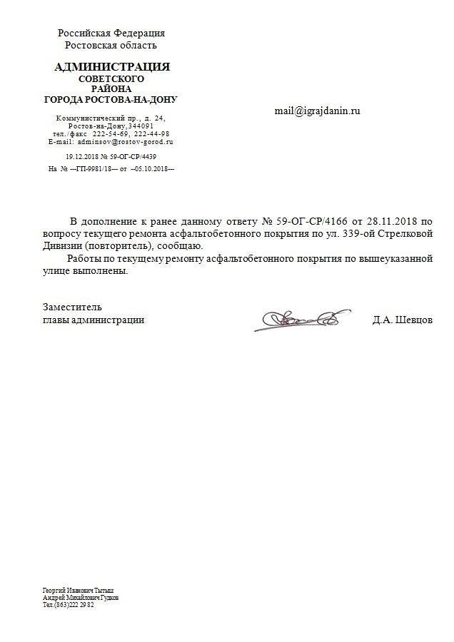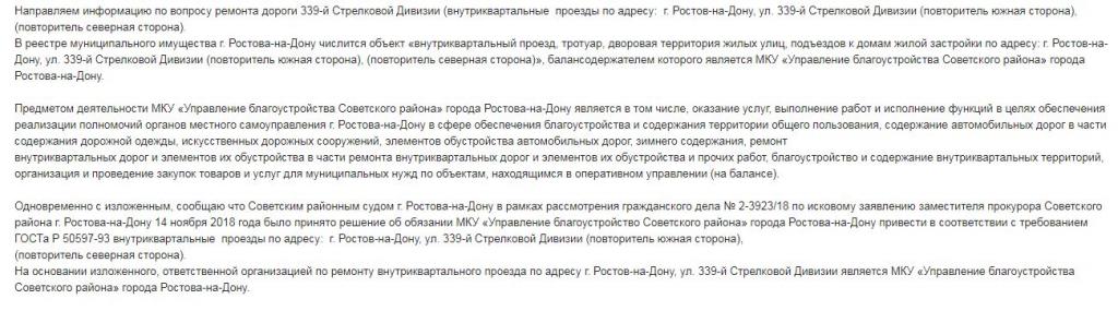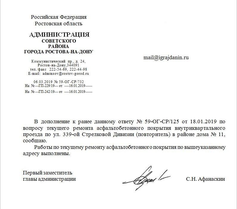 В дополнение к ранее данному ответу № 59-ОГ-СР/125 от 18.01.2019 по вопросу текущего ремонта асфальтобетонного покрытия внутриквартального проезда по ул. 339-ой Стрелковой Дивизии (повторитель) в районе дома № 11, сообщаю.