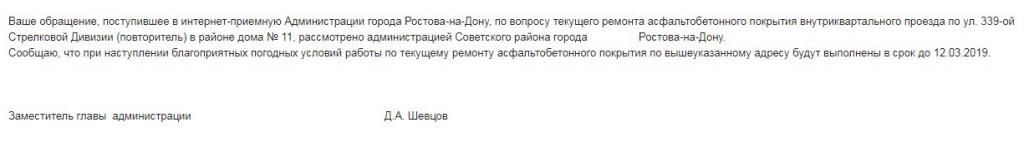 Ваше обращение, поступившее в интернет-приемную Администрации города Ростова-на-Дону, по вопросу текущего ремонта асфальтобетонного покрытия внутриквартального проезда по ул. 339-ой Стрелковой Дивизии (повторитель) в районе дома № 11, рассмотрено администрацией Советского района города Ростова-на-Дону.