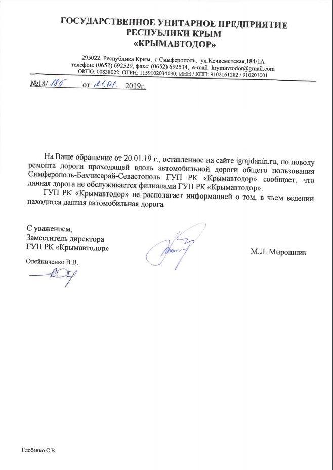 айГражданинОтправлено 20.01.2019: "Государственное унитарное предприятие Республики Крым «Крымавтодор» "