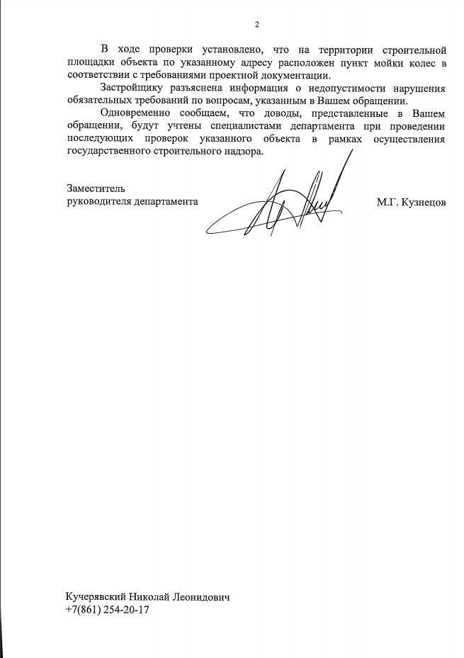 Роман Лявинзвоню этому Николаю Леонидовичу, очень интересно где он мойку на стройке видел, у меня квартира на 15 этаже вся стройплощадка отлично просматривается и моек там нет, вы сами видео посмотрите что выложил. Или они по бумагам проверяли?