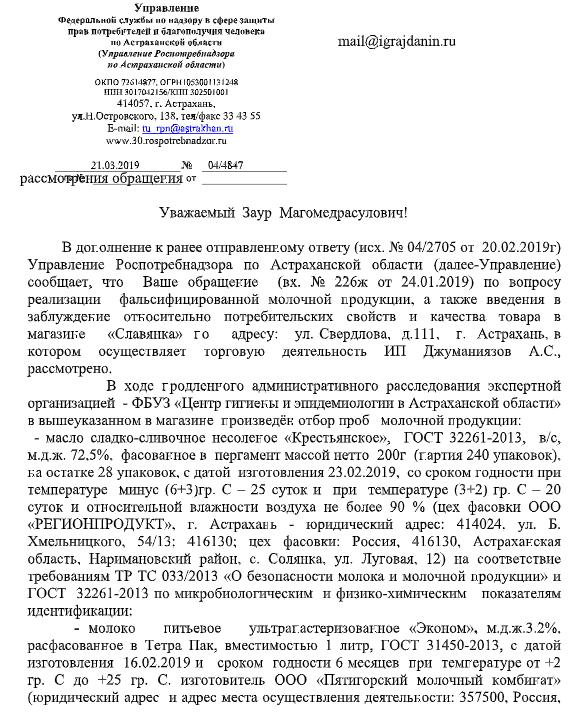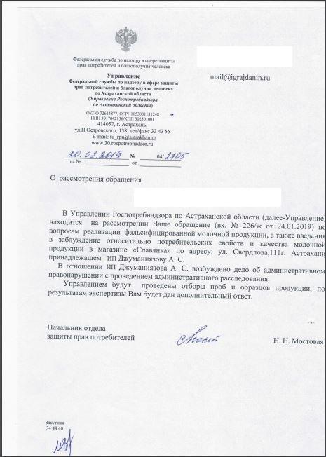 Как мне стало известно, в магазине "Славянка", ИП Джуманиязов Айбек Султанбаевич, расположенный по адресу: г. Астрахань, ул. Свердлова, 111 осуществляется реализация подозрительной молочной продукции: масло сливочное М.Д.Ж. 82,5% и 72,5% в пачках по цене ниже 500 рублей за 1 кг., сыр М.Д.Ж. 40-50% по цене ниже 400 рублей за 1 кг, молоко МДЖ 3,2% по цене ниже 40 рублей за 1 л.
