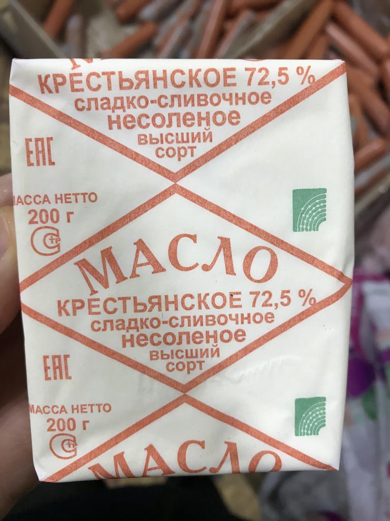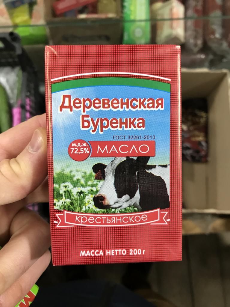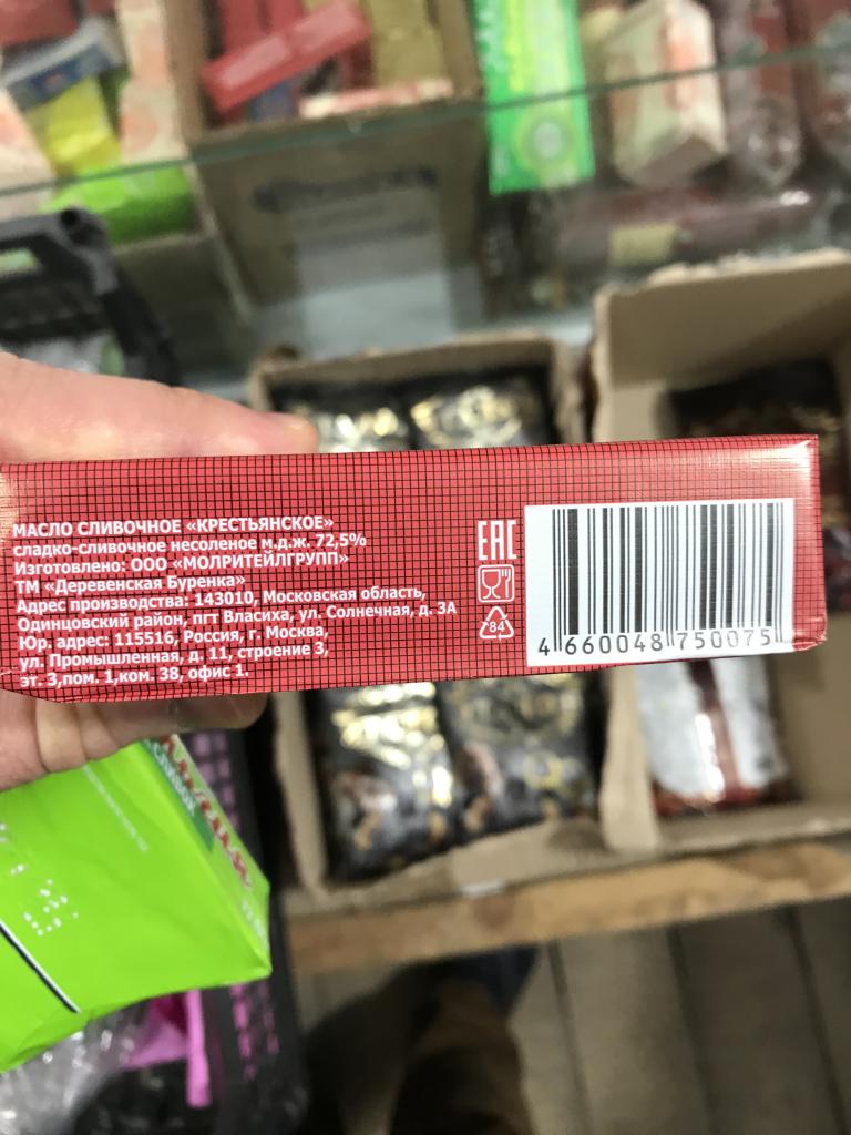 2) Масло сливочное крестьянское "Деревенская буренка", МДЖ 72,5 % (ГОСТ 32261-2013; масса нетто: 0,200 кг; дата изготовления - 18.12.18; произведено: ООО "МОЛРИТЕЙЛГРУПП", Россия, 115516, г. Москва, ул. Промышленная, 11, стр. 3, эт. пом. 1, ком. 38, офис 1; Адрес производства: 143010, Московская область, Одинцовский район, пгт Власиха. ул. Солнечная, 3 "А"), по цене 30 руб;