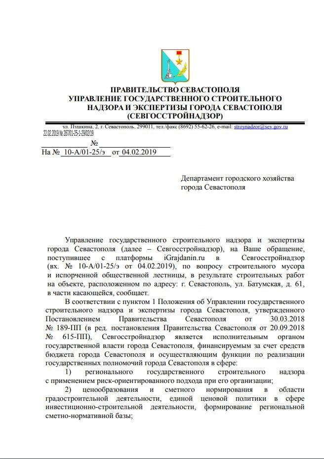 Управление государственного строительного надзора и экспертизы города Севастополя (Севгосстройнадзор)Ответ от 22.02.2019 № 287/01-25-1-29/02/19