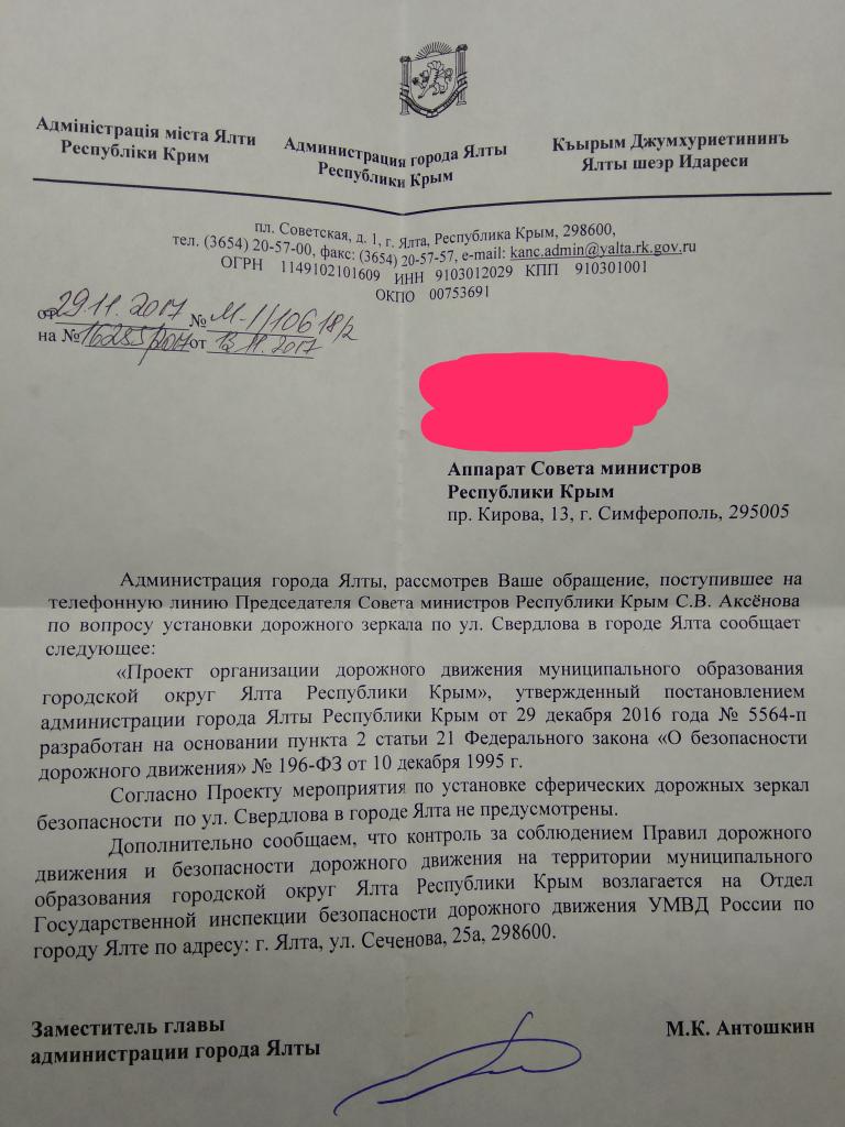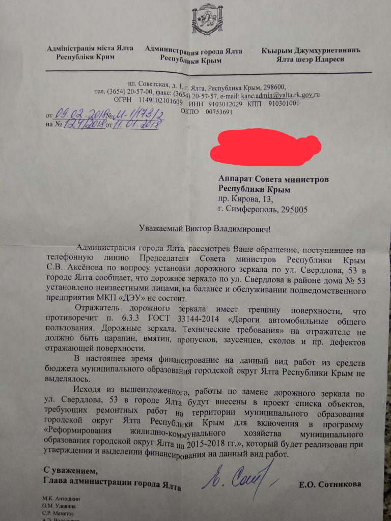 Виктор МелешинУстановка зеркала не самовольная , его устанавливали ещё при Украине, и оно очень нужно на этом участке дороге, как как повор закрыт, машинам и людям очень трудно выехать и выйти со двора. Это зеркало не так уж и дорого стоит для бюджета Ялты. Примерно до 10000₽. Выделите эти средства в 2019 году и замените его.