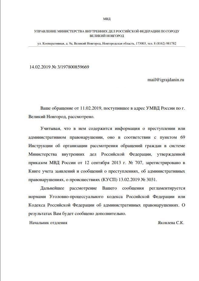 айГражданинОтправлено 11.02.2019: "Управление МВД России по Новгородской области"