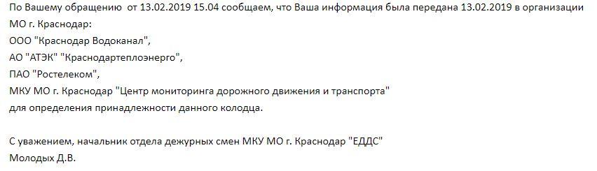 айГражданинОтправлено 13.02.2019: "МКУ МО город Краснодар "Единая дежурно-диспетчерская служба""