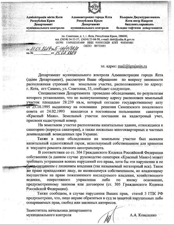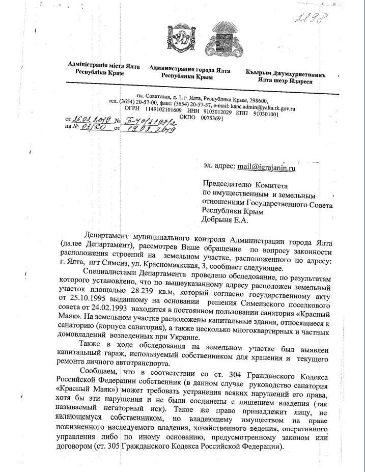 айГражданинОтправлено 15.02.2019: "Администрация города Ялты республики Крым"