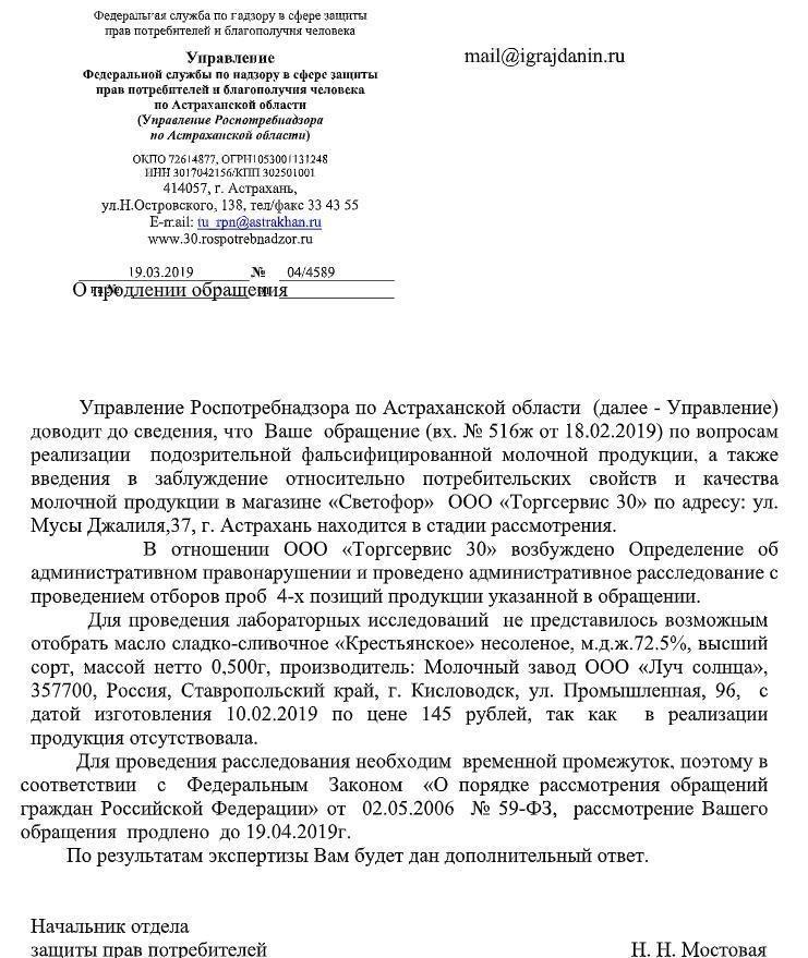 Как мне стало известно, в магазине "Светофор", расположенный по адресу: г. Астрахань, ул. Мусы Джалиля, 37 осуществляется реализация подозрительной молочной продукции: масло сливочное М.Д.Ж. 82,5% и 72,5% в пачках по цене ниже 500 рублей за 1 кг., сыр М.Д.Ж. 40-50% по цене ниже 400 рублей за 1 кг, творог М.Д.Ж. 0-9% по цене ниже 240 рублей за 1 кг.