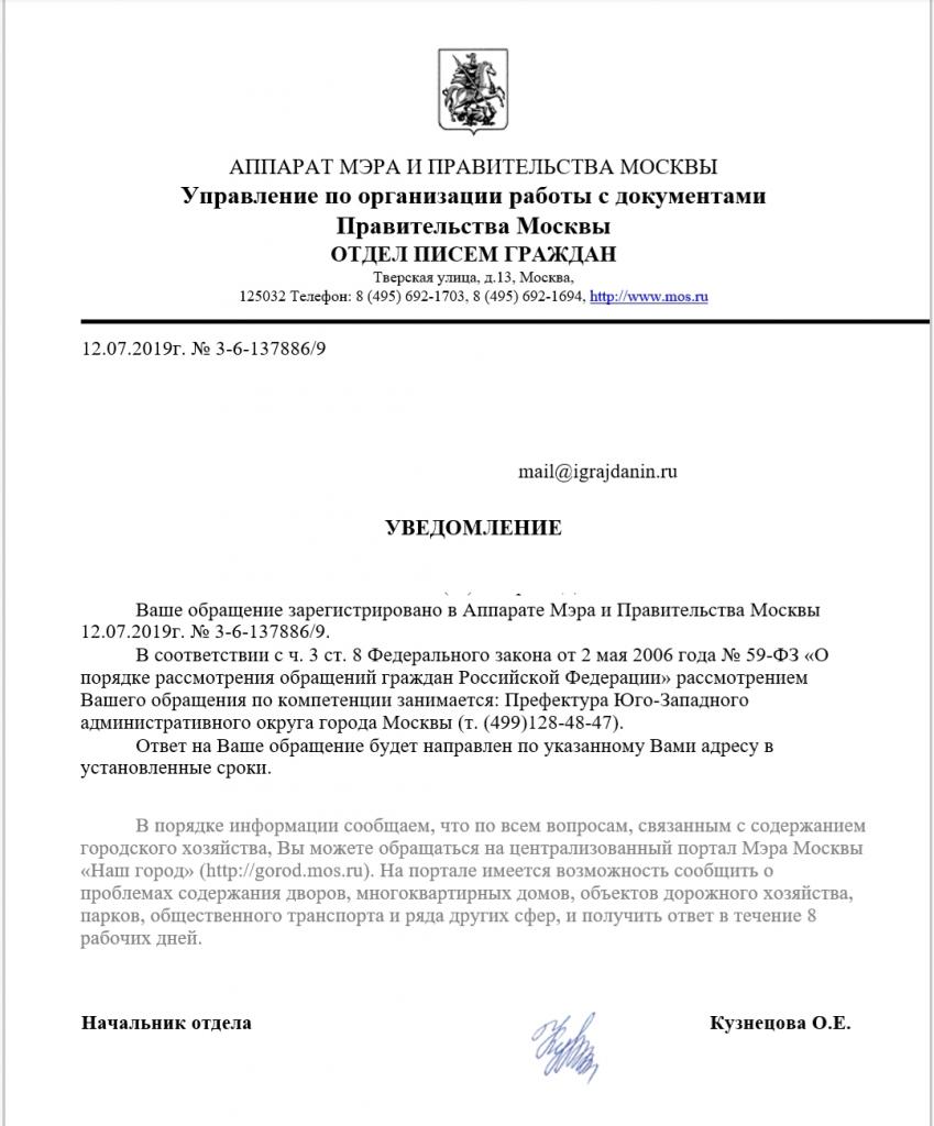 Ваше обращение было перенаправлено в Префектуру ЮЗАО.