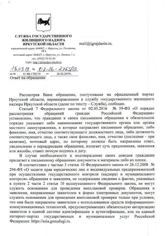 айГражданинОтправлено 25.02.2019: "Cлужба государственного жилищного надзора Иркутской области"
