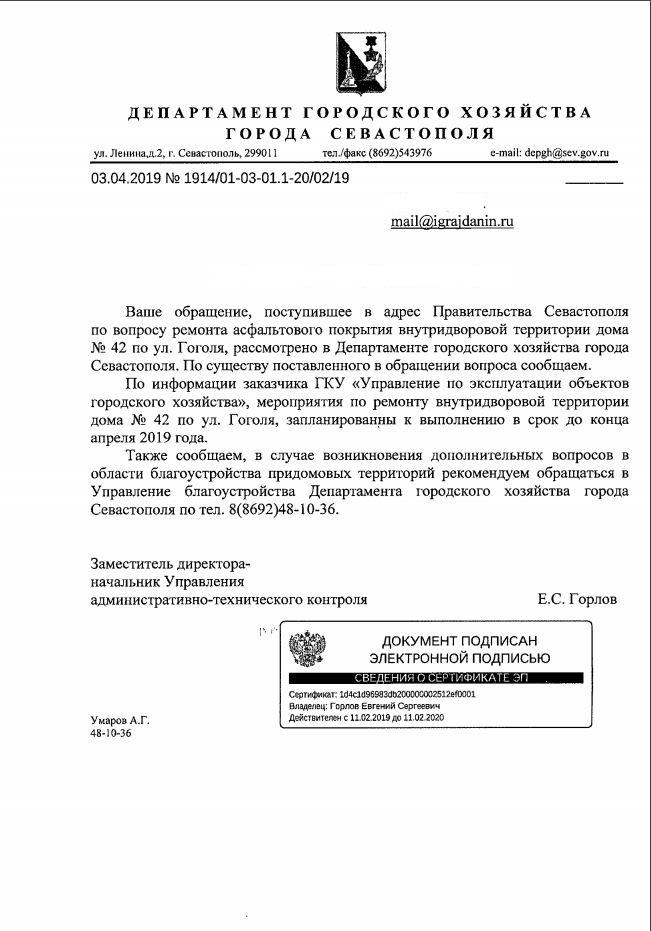 айГражданин Отправлено 05.03.2019: "Департамент городского хозяйства города Севастополя"