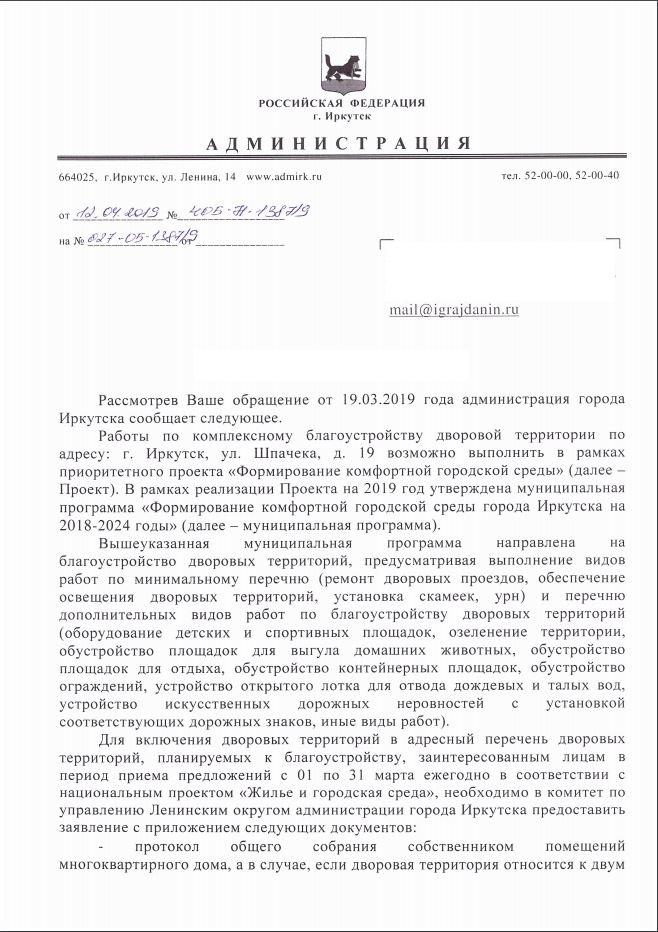 айГражданинОтправлено 19.03.2019: "Администрация города Иркутска"