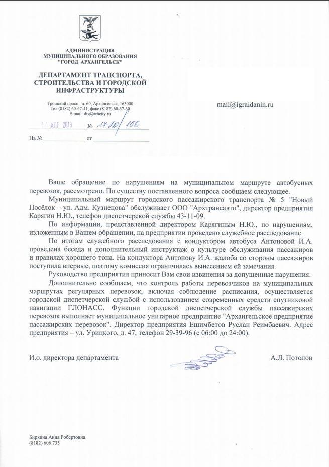 айГражданинОтправлено 01.04.2019: "Департамент транспорта, строительства и городской инфраструктуры Администрации муниципального образования "Город Архангельск""