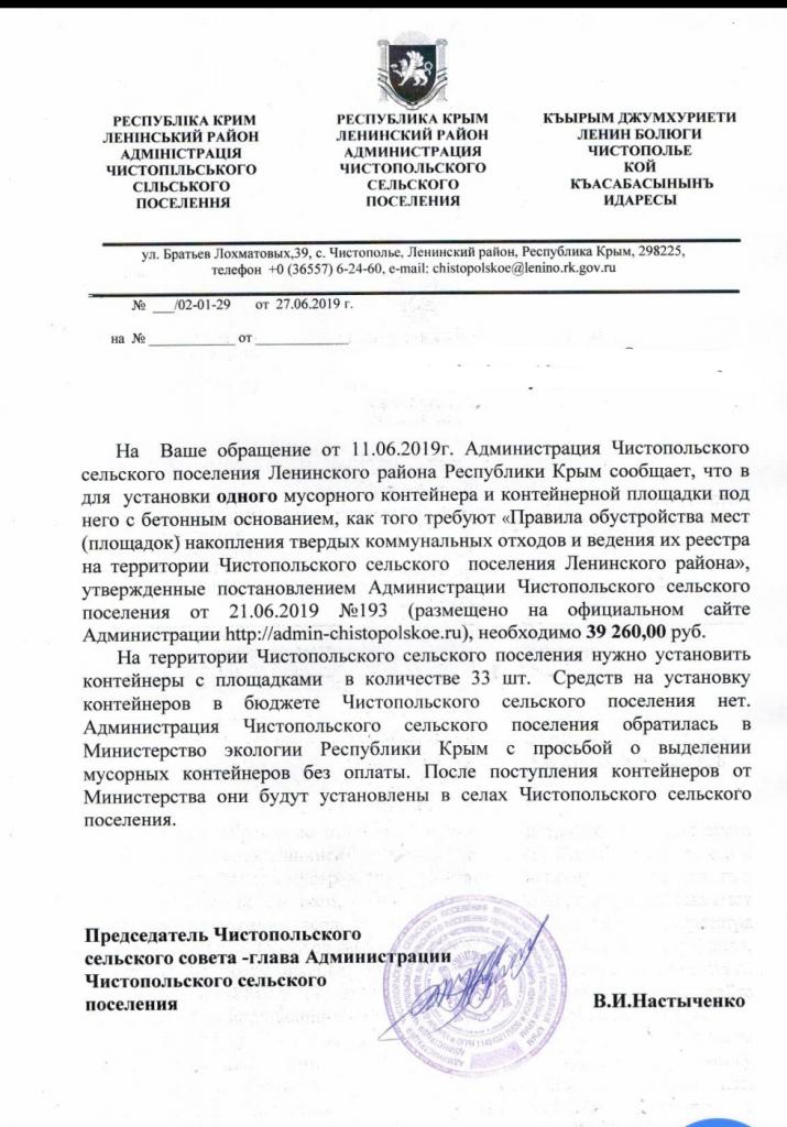 айГражданинОтправлено 11.06.2019: "Администрация Чистопольского сельского поселения Ленинского района Республики Крым"