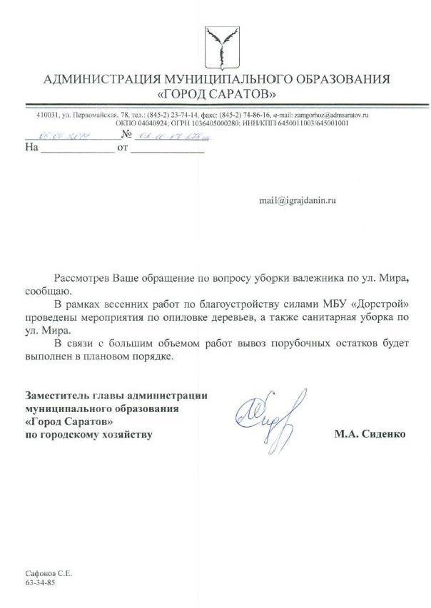 айГражданинОтправлено 09.04.2019: "Администрация муниципального образования "Город Саратов""