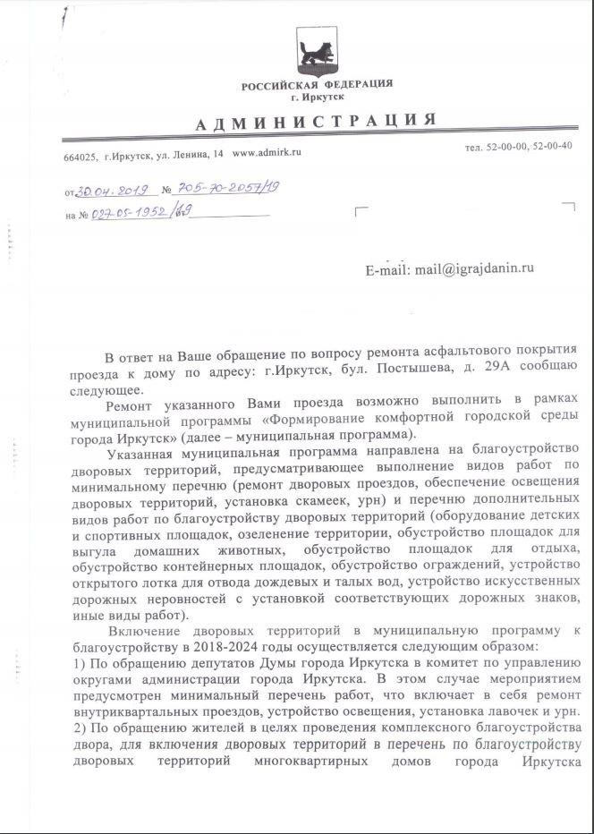 айГражданинОтправлено 09.04.2019: "Администрация города Иркутска"