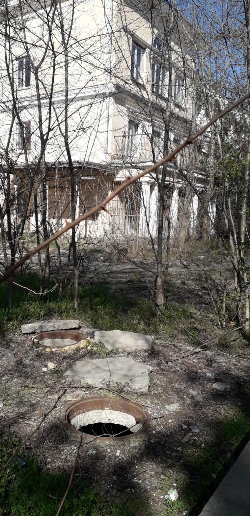В курортной части г.Евпатории  заброшеное здание, территория не ухоженая, мусор и два открытых люка.