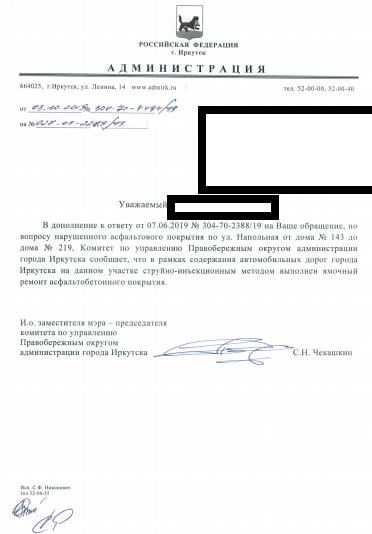 Вас беспокоит главный специалист отдела коммунального хозяйства управления ЖКХ комитета по управлению Правобережным округом администрации города Иркутска Никонович Светлана Федоровна. У меня на контроле находится Ваше обращение по вопросу нарушенного асфальтобетонного покрытия при ремонте смотровых колодцев по ул. Напольная, 143 – 219.