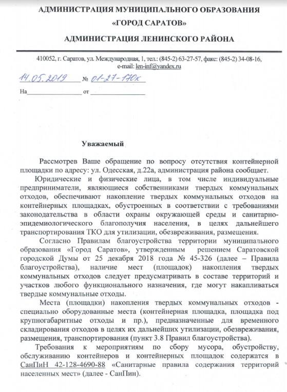 18.04.2019: Администрация Ленинского района города Саратова