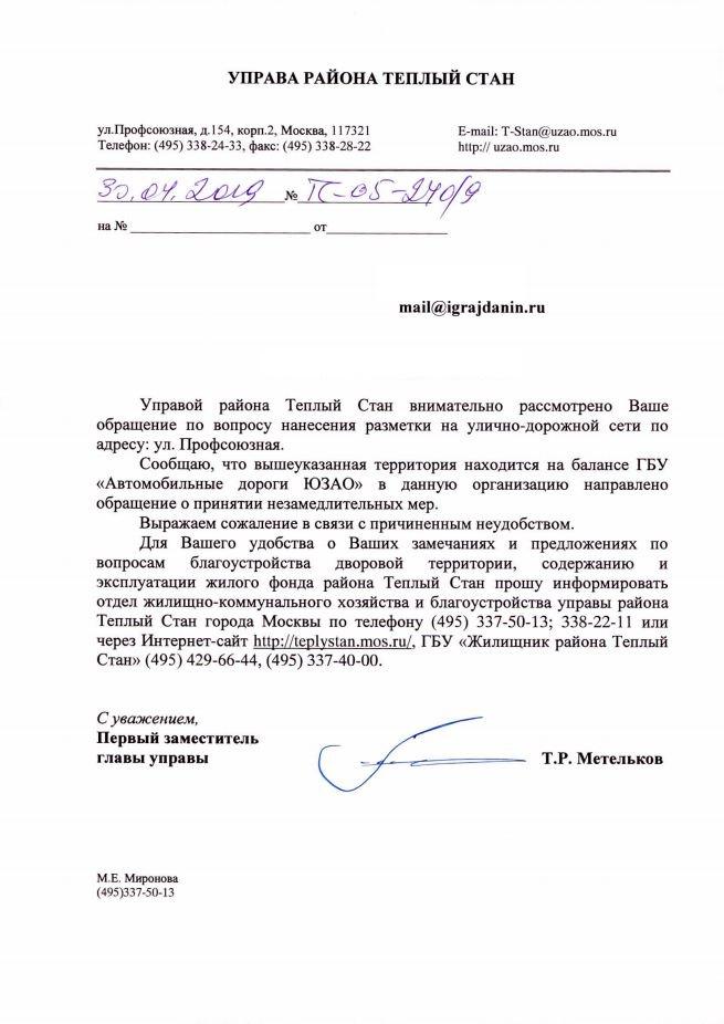 айГражданинОтправлено 24.04.2019: "Управа района Тёплый Стан города Москвы"