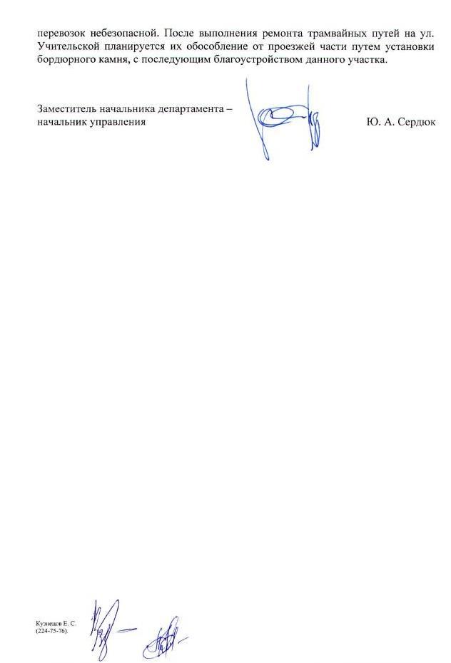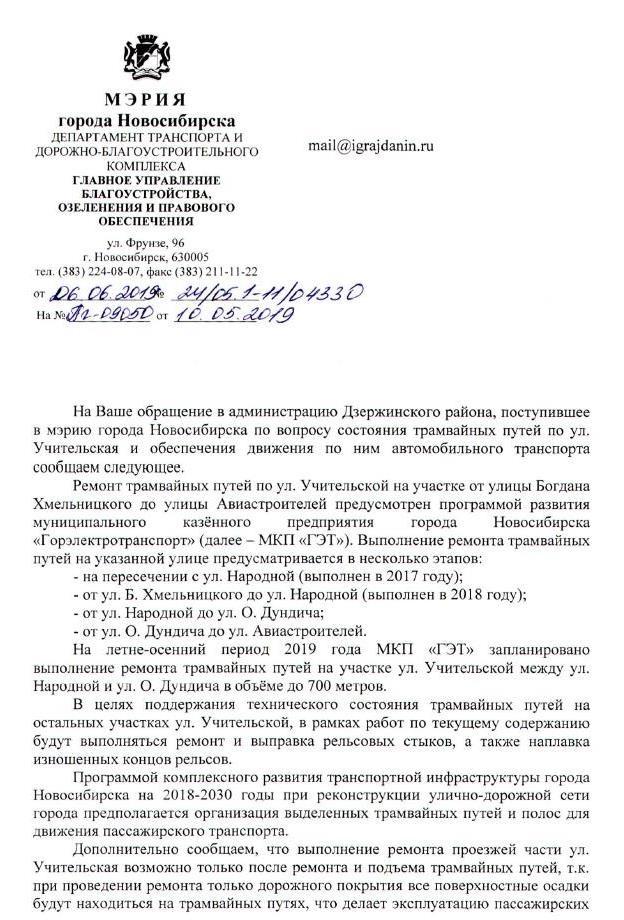 Сегодня получила Ваш ответ. Как раз сегодня утром находилась на улице Учительская, состояние дороги ужасное, трамвайных путей еще хуже... где и когда был произведен ремонт - честно даже вооруженным глазом не видно. Могу сказать, что в данный момент состояние никакое. Даже нанесенная в этом году разметка -пешеходного перехода, уже в не очень хорошем состоянии... Можно ли узнать какой именно краской вы наносите разметку? Какова ее долговечность на дорожном покрытии ? Какая толщина слоя должна наносится краски по нормативам и какова стоимость этих работ. Думаю, что идет полное нарушение всех норм и сокращение бюджета для проведения дорожных работ. Также, в момент моего пребывания на ул. Учительская произошла авария с участием трех машин, пострадали люди, очевидцы запечатлели все и есть даже статья об этом происшествии на сайте https://vk.com/act54. Все комментируют об ужасном состоянии дороги, и люди даже не понимают, как могла произойти такая авария на данном участке дороги, т.к. скорость там особо не превысишь.