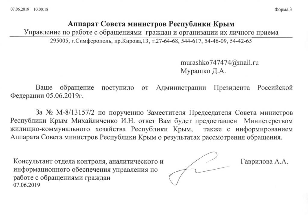 Дмитрий МурашкоОтчаявшись получить ответ от местных властей, отправил обращение в Администрацию Президента РФ!! И о чудо, прошло чуть более суток и пришел первый ответ. Я так понимаю, заставить работать чиновников в Крыму под силу только Президенту, иначе шевелиться никто не хочет!? Прикрепляю полученный ответ. Пока никакой конкретики по решению проблемы, но все же лед тронулся.