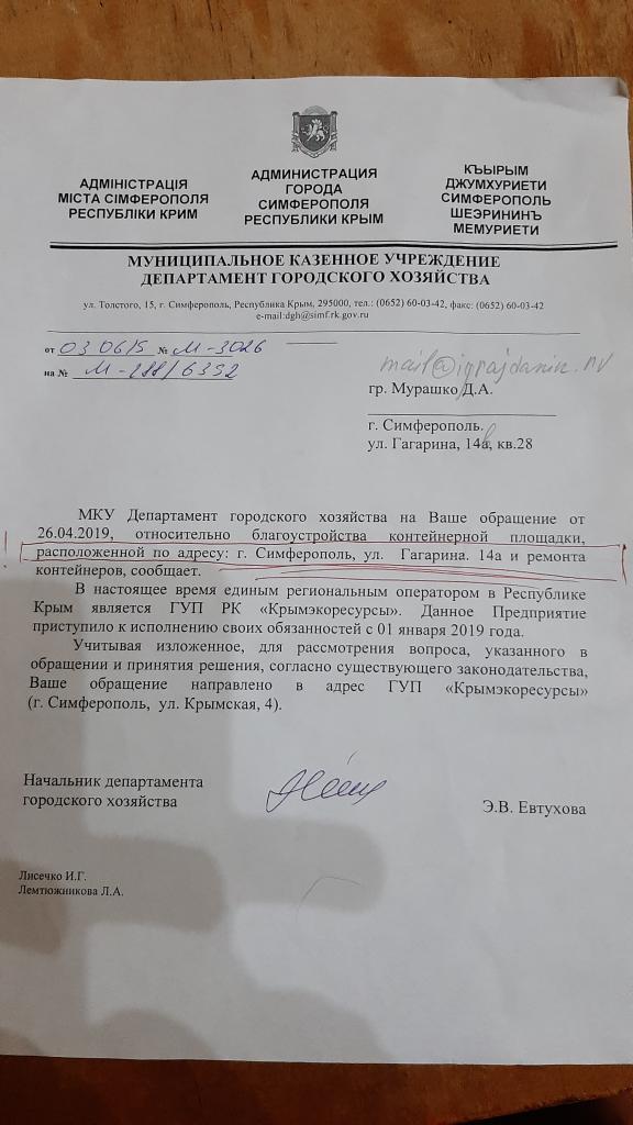 Дмитрий МурашкоИ в дополнение очередной ШЕДЕВРАЛЬНЫЙ ответ № М-3026 от 03.06.2019 за подписью начальника департамента городского хозяйства Евтуховой Э.В. Теперь понятно почему решение нашей проблемы до сих пор не сдвинулось с мертвой точки! Госпожа Евтухова Э.В не то что не вникала в суть проблемы, а даже и не пыталась это сделать, поскольку как видно из подписанного ей официального ответа, не имеет понятия где находится данный проблемный объект, и в ответ дан по мусорной площадке, расположенной по адресу: г. Симферополь, ул. Гагарина 14, а (обведено красной пастой). Откуда этот адрес? Какое отношение он имеет к озвученной выше проблеме?