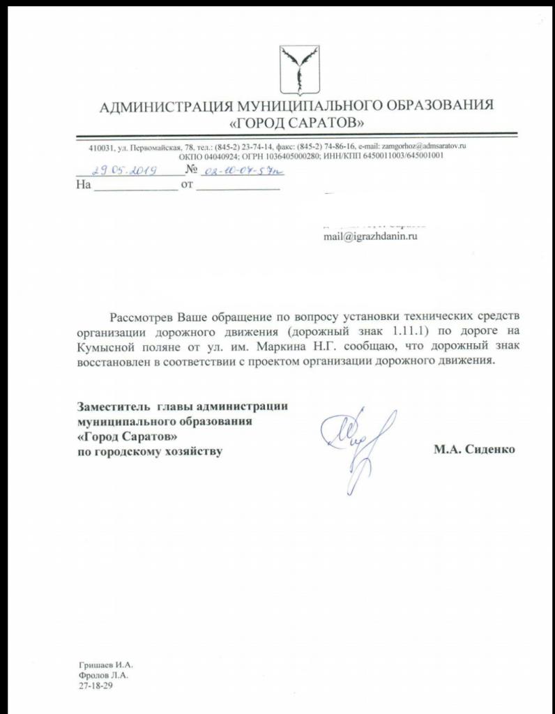 айГражданинОтправлено 30.04.2019: "Администрация муниципального образования "Город Саратов""