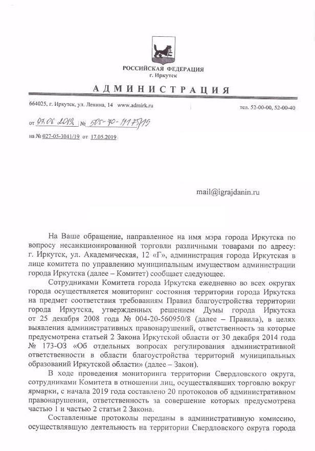 айГражданинОтправлено 15.05.2019: "Администрация города Иркутска"