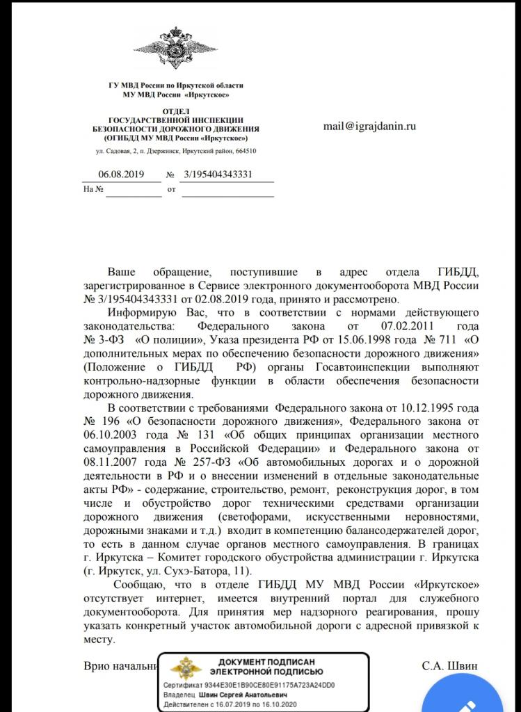 айГражданинОтправлено 02.08.2019: "Управление ГИБДД ГУ МВД России по Иркутской области"