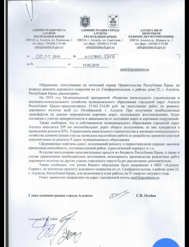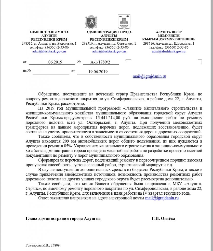 айГражданинОтправлено 18.06.2019: "Администрация города Алушты республики Крым"