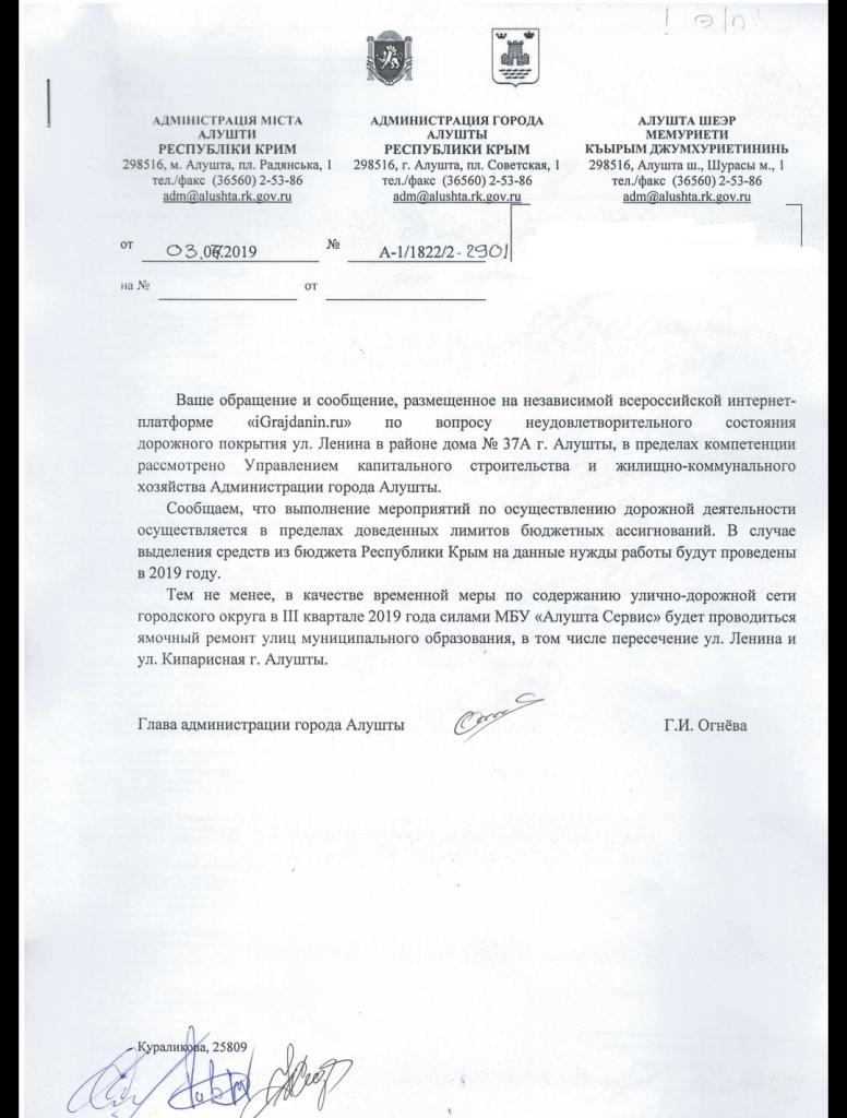 айГражданинОтправлено 20.06.2019: "Администрация города Алушты республики Крым"
