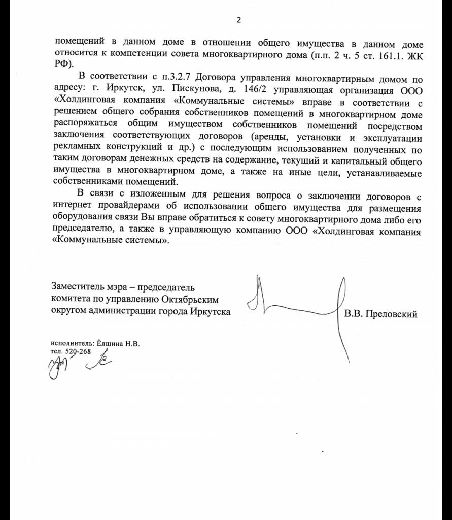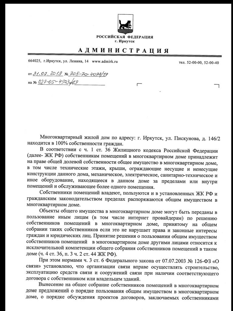 По информации от старшего дома на данный момент интернет провайдеры ( Эр-телеком холдинг, ТрансТелеком, Ростелеком, возможно другие операторы ) разместили оборудование на территории дома без согласования с собственниками дома. Данное обстоятельство является нарушением ч. 3 ст. 36 ЖК РФ, п. 3 ч. 2 ст. 44 ЖК РФ. Согласно которым: решение о порядке использования помещений, относящихся к общему имуществу, может принять только общее собрание собственников такого дома. Соответственного решения собранием собственников утверждено не было. В связи с чем прошу проверить законность размещения оборудования, и в случае нарушения обязать провайдеров легализовать свой статус на территории дома.