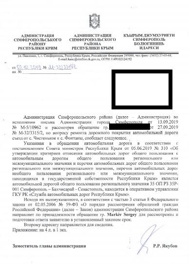 Администрацию платформы Ягражданин прошу направить моё обращение в Главное управление юстиции РФ по Республике Крым для внесения предписания об устранении недостатков по фактам не предоставления мотивированного ответа, не принятия мер по ремонту дорожного полотна и приведению его в соответствие с СНиП!