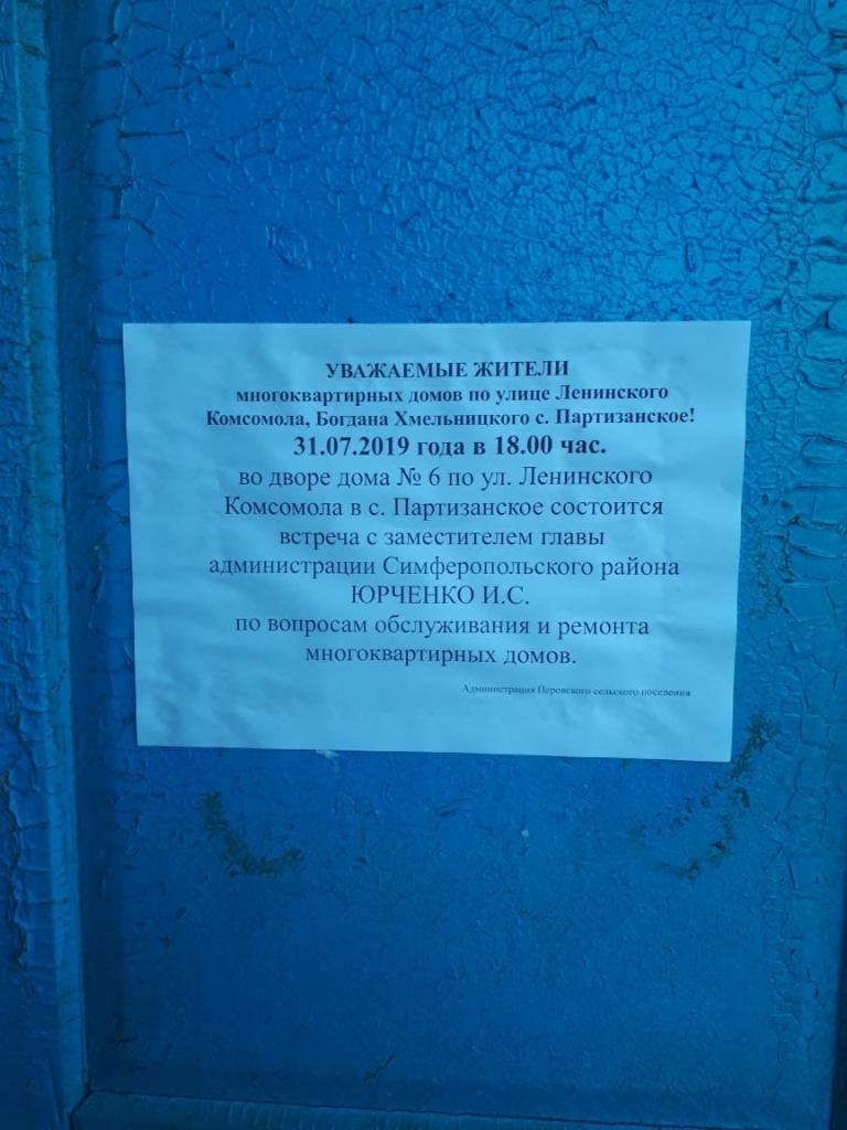 31 июля 2019 года заместитель главы Симферопольского района Юрченко И.С. провёл встречу с жителями многоквартирных домов. Но выбранное время для встречи не удобно для остальных жителей так как многие работают в Симферополе и других городах, тем самым не смогли приехать на встречу.