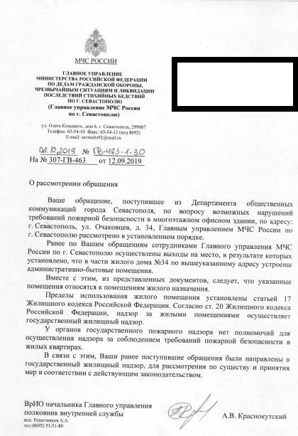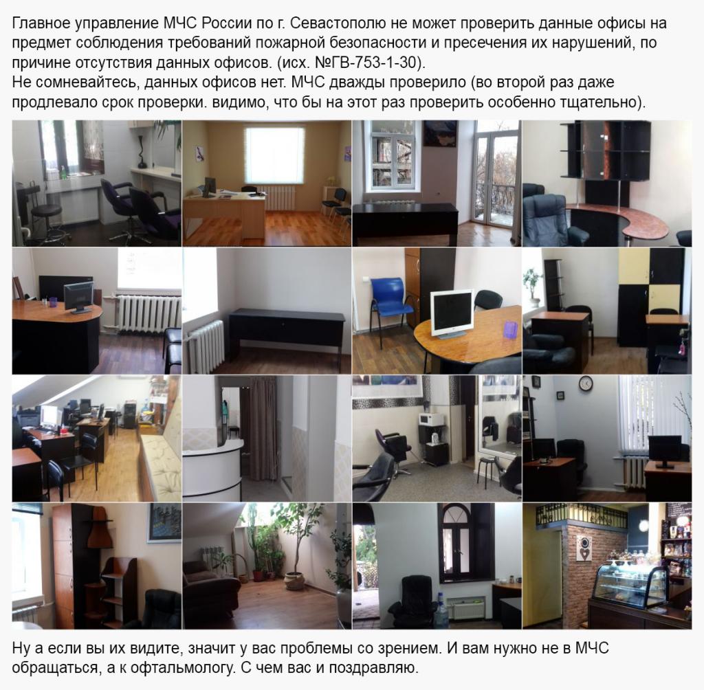 Однако МЧС снова отказалось от проверки данных офисных и производственных помещений, вновь заявив, что никаких офисов по данному адресу ему обнаружить не удалось. Дословная цитата из ответа МЧС: "...установлено, что по адресу: г. Севастополь, ул. Очаковцев, 34 расположен двухэтажный жилой дом, а указанные в ранее направленных обращениях помещения, являются жилыми квартирами".