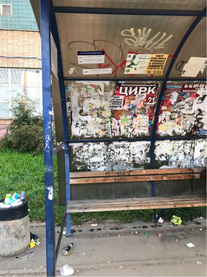 Прошу очистить остановочный павильон возле дома 35 по улице 25 сентября (на фото) от приклеиных рекламных плакатов и объявлений