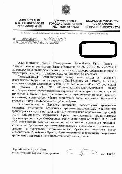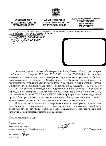 Нет необходимости перенаправлять ,ранее направленные отписки. Вами не предприняты меры в отношении собственника данного грузового автомобиля при предоставлении услуг в местах не установленных для этих целей , ( чем нарушена ст. 6.1 Закон Республики Крым от 25 июня 2015 г. N 117-ЗРК/2015 "Об административных правонарушениях в Республике Крым" я неоднократно обращался в службу ЕДДС ,в тот момент когда ренген кабинет работал , однако вами данные обращения не приняты во внимание.)