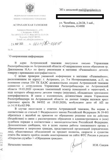 Заур АлибулатовДля эффективности рекомендую направить в Федеральную Таможенную Службу
