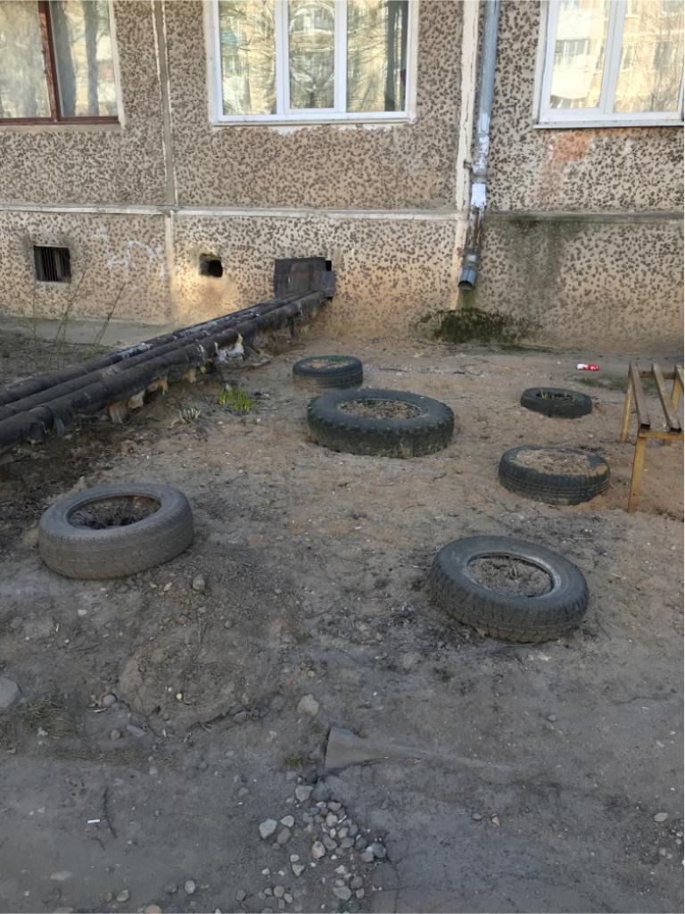 Прошу очистить двор дома 11 по улице Румянцева от старых покрышек (на фото)