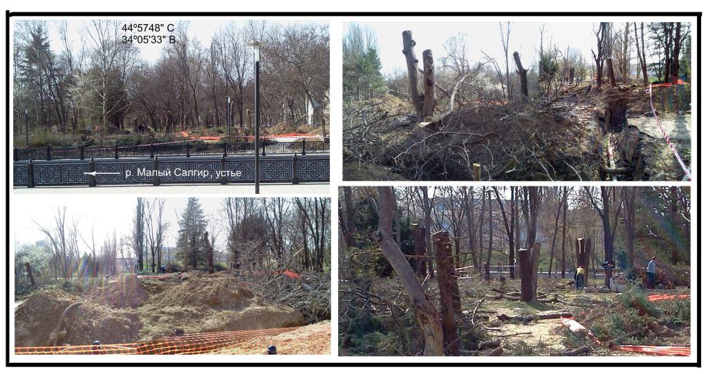 В городе Симферополе  28 марта 2020 г на правом берегу р. Малый Салгир у ее устья происходит массовое уничтожение садовых и ореховых деревьев Гагаринского парка. Координаты  нарушения 44º5748" C    34º05'33" B. Фото прилагается.
