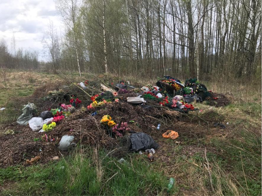 Прошу выполнить уборку незаконной свалки на территории Софьинского кладбища ( на фото)
