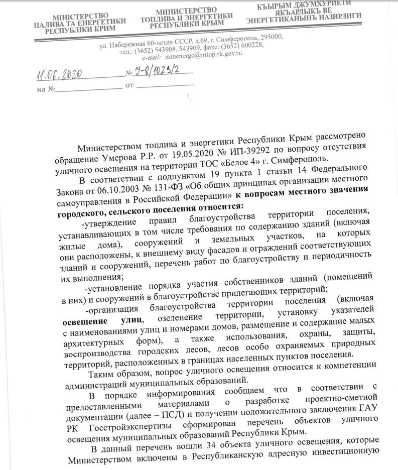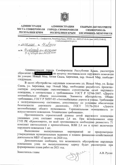 В связи с принятием программы по уличному освещению в г.Симферополе просим включить освещение и данных улиц в указанные программы , жители готовы принять участие в оказании необходимой помощи. Организован ТОС "БЕЛОЕ-4" .