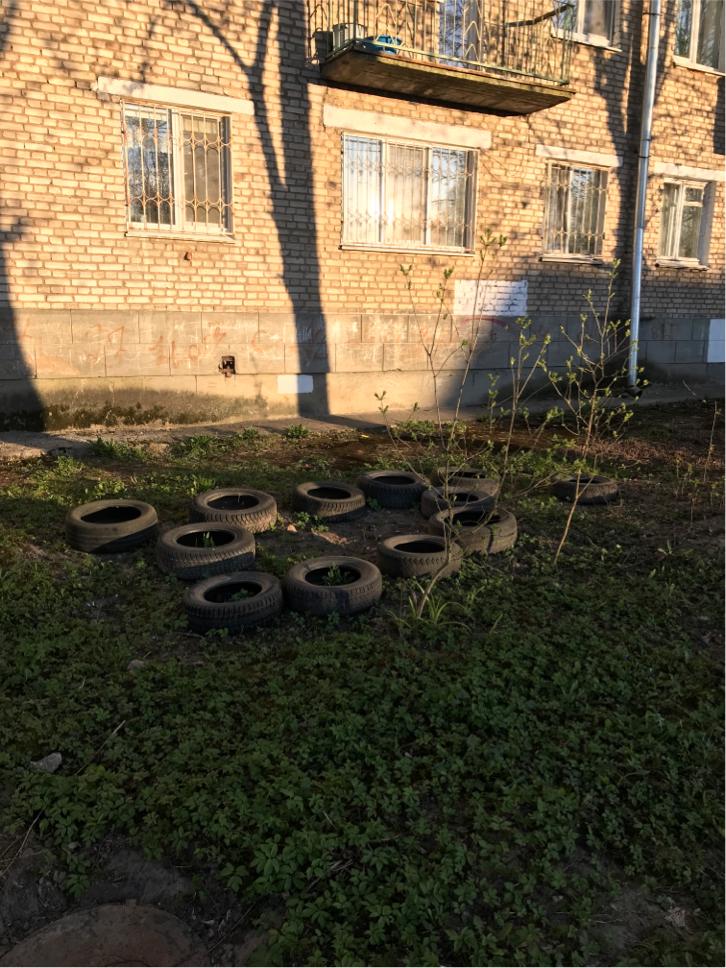 Прошу вывести старые покрышки с зелёной зоны, напротив дома 16 по улице Энгельса ( на фото)