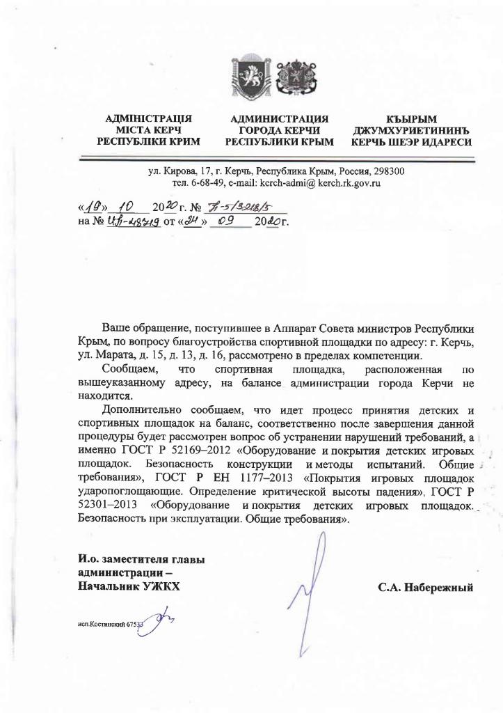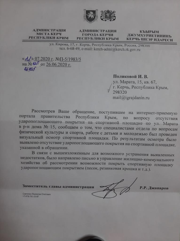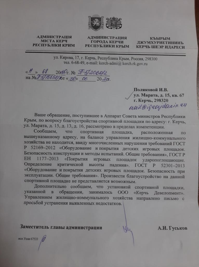 К вышеизложенным вопросам прилагаю фото тренажера, вызывающего опасения, и письма из Администрации города. Надеюсь на положительное решение нашего вопроса.